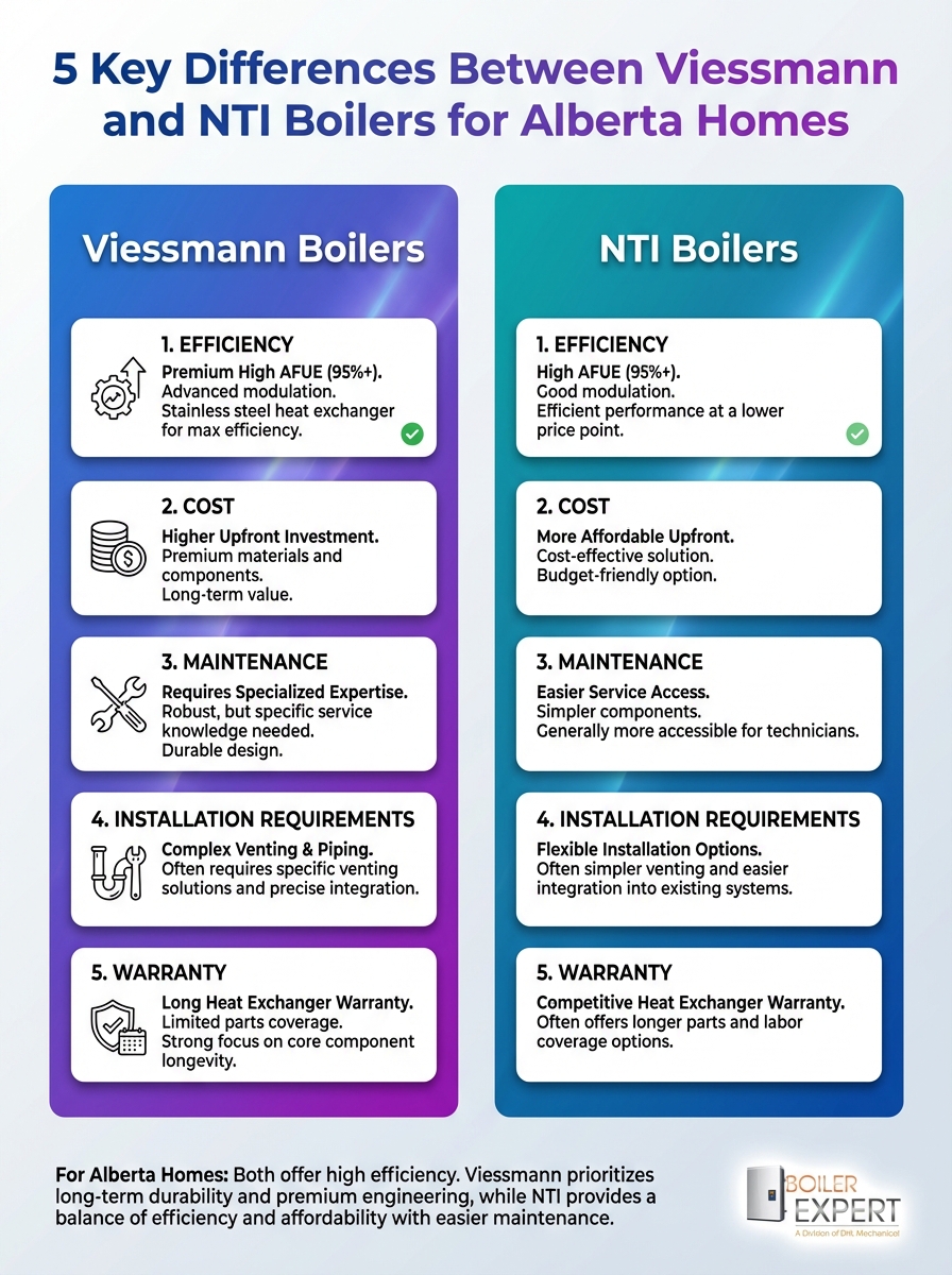 This infographic highlights the five main differences between Viessmann and NTI boilers for Alberta homes. It helps homeowners decide which boiler is best for their climate and energy needs.